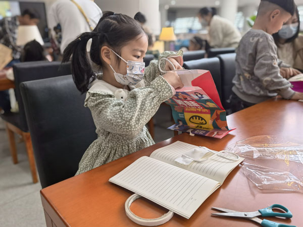 我们不仅要爱读书,还要爱护书。老师带领孩子们学习了图书的分类,引导孩子们图书应该放置的正确位置,还对阅览室的图书进行了整理。“爱护一本书,从包书皮开始”,随后在老师的带领下,孩子们给自己的书都穿上了美丽的外套,一个个手提袋转眼变身成一个个精美别致的书皮。